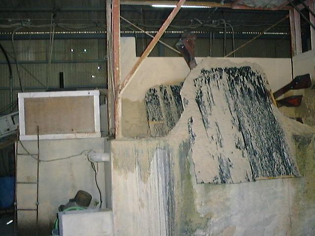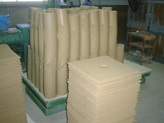 ゴミがとれたら、水を抜いて練り、製品にする。水抜き直後は、座布団の形になる。これを練って空気を抜いた物が円柱状の物。 |