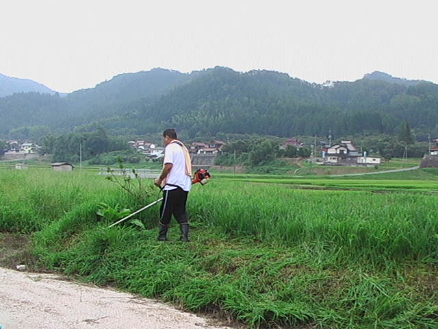 | まずは草刈りです。 畑の持ち主、N村ティーチャーに 草の借り方を習いました。 |
