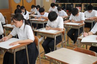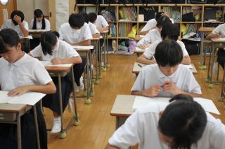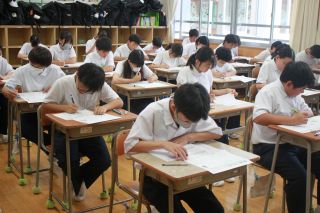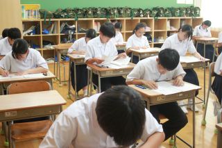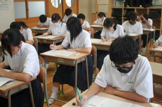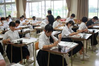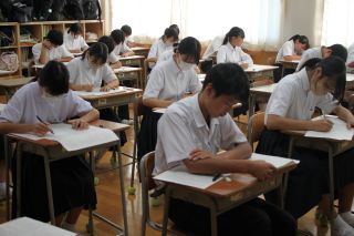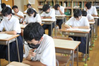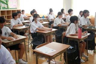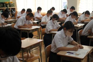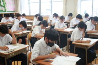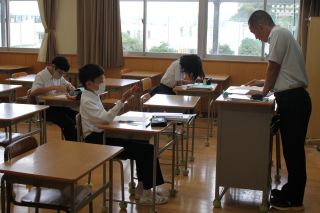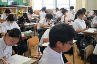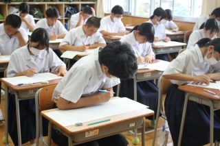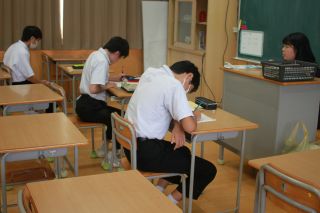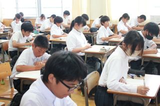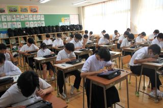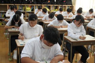 8月28日(木)3校時の授業の様子です。1,2年生は、2校時までの夏休み明けテストを終え、学級活動をしています。3年生は、習熟度テストを5校時まで実施します。3校時は、英語科のテストに取り組んでいる最中です。