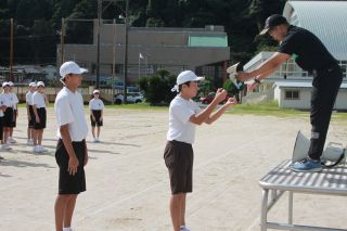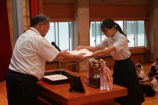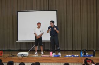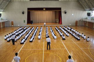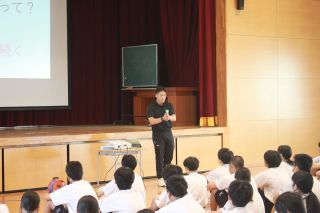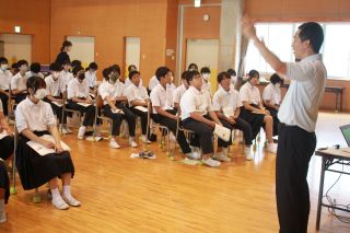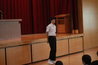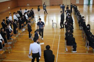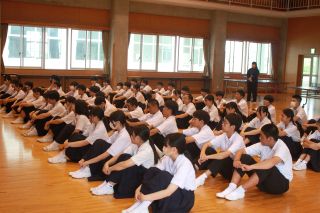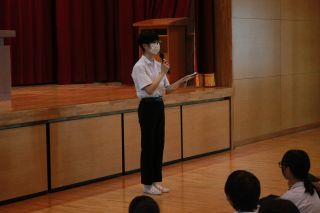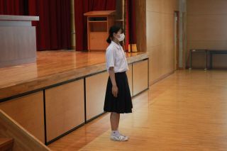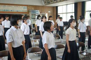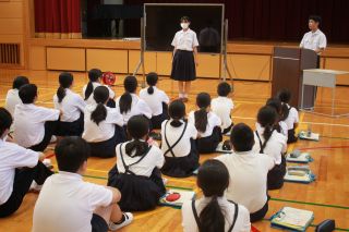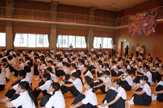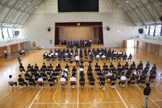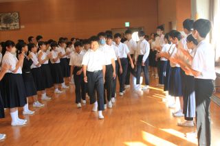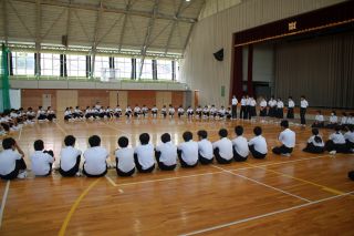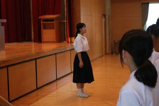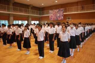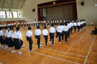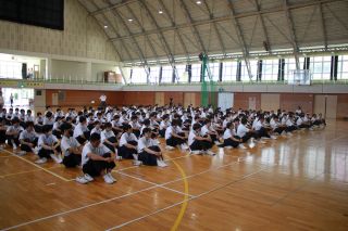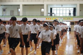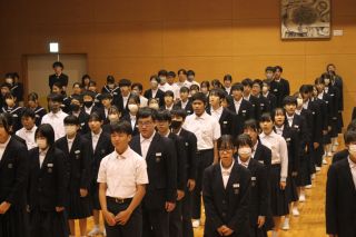 9月3日(水)1校時の前に、9月の生徒集会を実施しました。校長から、自分の欲求を上手に制御し、周囲の人たちと協力して生活する大切さについて話がありました。その後、保健体育科の教員から、体育祭の練習時に熱中症対策として準備するものや心構えについて、指導がありました