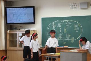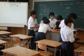 5校時に2年生の英語の授業を参観しました。本県や京都、熊本等のご当地グルメについて、班で協力しながら画像を用いて英語で紹介し、振り返りとしてよかったところや気づきを書き出す授業でした。子どもたちの堂々と発表する姿が印象に残っています。