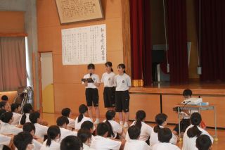 6月26日(木)本日は、1、2校時に県教委訪問、3校時に保健体育科の授業を軸に町保健相談センター職員、栄養教諭、町園小中養護教諭が集う研究授業、1~4校時に町短歌会の方々を講師に、1、2年生全クラスを対象にした短歌教室、6校時に3年生を対象にワキ薬局佐々薬剤師を講師に、薬物乱用防止教室を実施しました。多くの方々にご来校いただくとともに、子どもたちの指導に携わっていただき、心から感謝しています。