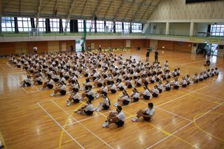 8月27日(水)夏休みが終わり、久しぶりに子どもたちが教室に戻ってきました。1校時、1、2年生は、夏休み明けテストを受けています。第3学年は、多目的ホールで学年集会を実施しています。