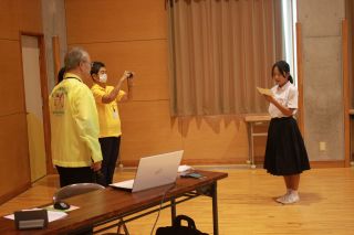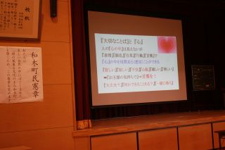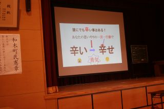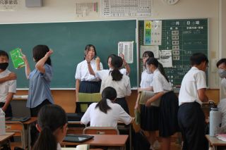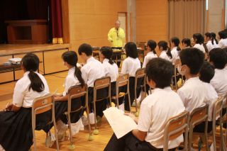 6月25日(水)4校時に多目的スペースで、「認知症サポーター中学生養成講座」が実施されました。5名の認知症サポーターキャラバンメイトを含め、8名もの方々にご指導をいただきました。認知症について、分かりやすく教えていただくと同時に、認知症が疑われる方に出会ったときにどのように対応するかをクイズ形式で確認させていただきました。その後、キャラバンメイトの方々と和木駐在所の巡査とともに、認知症の方に出会った時のシミュレーションをロールプレイの形式で行いました。子どもたちには、だれにでも起こりうる脳の病気に起因する認知症に対する正しい理解を基に、認知症になられた方々も安心して暮らせるまちづくりに積極的に関わってほしいと思います。