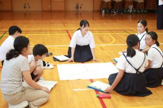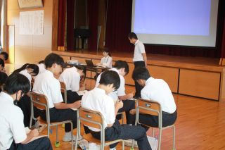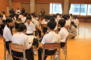 7月8日(火)6校時に、多目的スペース等を使用して体育祭に向けた隊別集会を開きました。体育祭実行委員長や隊長、副隊長、応援団員が中心となり、赤、白隊の生徒の係を決めたり、それぞれの体育祭にかける思いを語ったりしました。その後、岩国警察署生活安全課の方から、情報モラルについてご指導をいただきました。