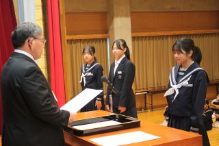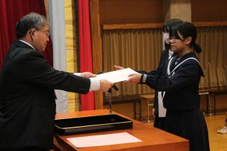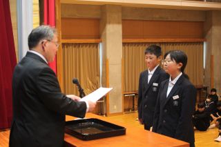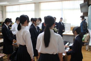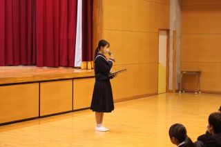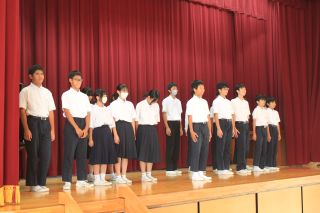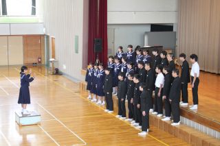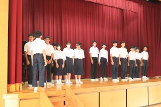 10月10日(金)本日は、午前中に2年生が県学力定着状況確認問題に取り組みました。国語、数学、英語のCBT方式です。午後からは体育館で文化祭合唱コンクールの課題曲中間発表が行われました。他のクラスの歌声を聞くことが、とてもよい刺激になったようです。また、明日、明後日に開催される県新人体育大会の壮行式も行われました。学校だよりでも紹介したとおり、3団体と1ペアが出場します。ベストを尽くして頑張ってきてほしいと思います。