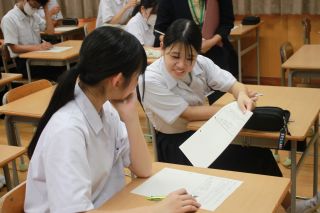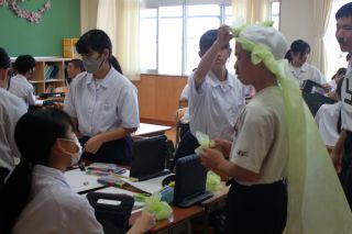 7月11日(金)本日5、6校時に、多目的スペースで1年生を対象に、異文化理解教育に関わる講演会を実施しました。フィンランドからヘルシンキ大学社会科学部で障害学に携わっておられる勝井久代教授にご来校いただきました。本校生徒と同世代のお嬢様お二人とともに、フィンランドの人口や地理的特徴、文化、生活様式、学校生活の様子などについて、クイズを交えながら具体的にお話をしていただきました。今後もこのような機会を通して、生徒が異文化を理解しようとする気持ちを育んでいきたいと思います。