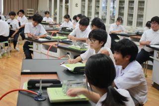 7月10日(木)本日3、4校時に、理科の一人一授業が実施されました。対象は1年生で、ガスバーナーの使い方を正確に理解しているかどうかについて、班ごとにタブレットで動画を撮りながらパフォーマンステストを行いました。写真は、3校時の授業の様子です。2校時の英語科の授業の様子を写した写真と共にご覧ください。